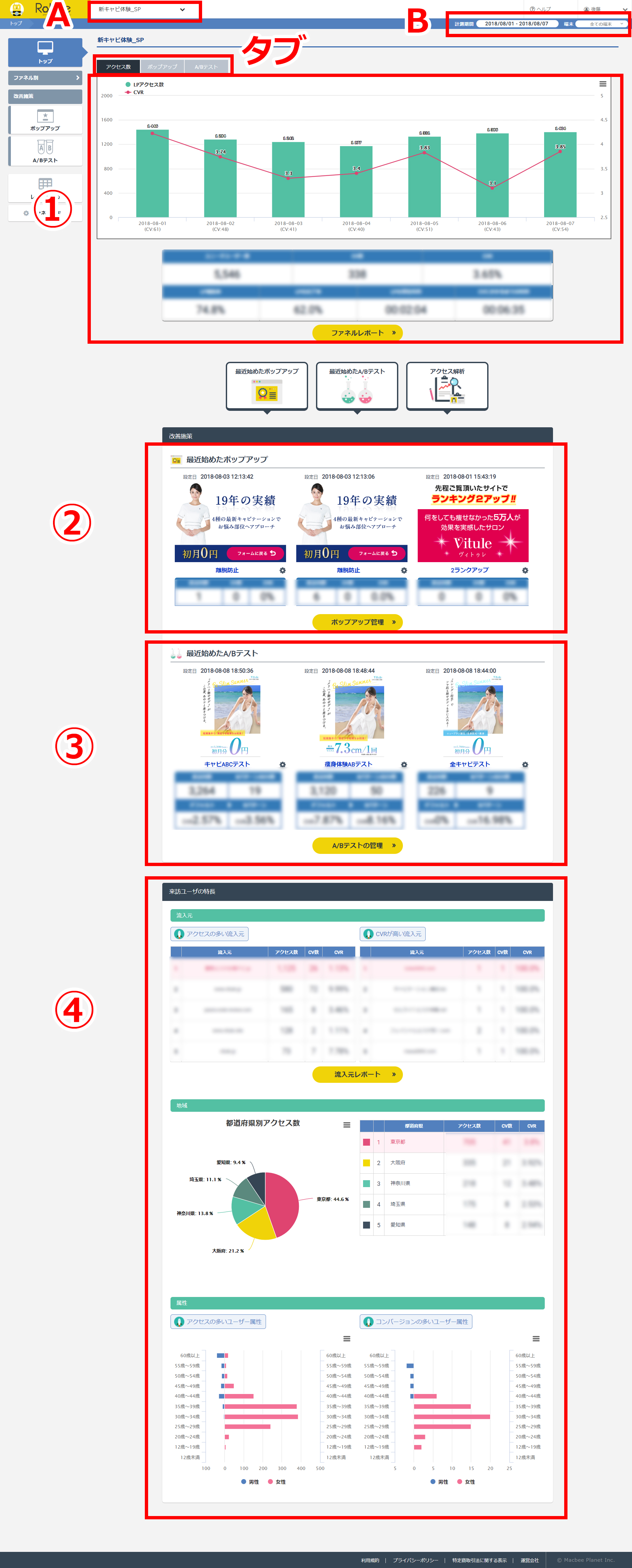 ファネルごとの流入数はもちろん、A/Bテストなどによる改善率や、来訪ユーザーの属性情報などを ひと目で確認できます。