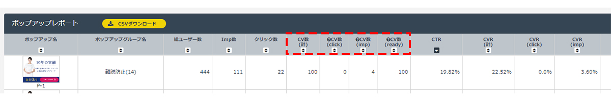 - CV数(ready)… 表示条件に合致せず、ポップアップが表示されずに、CVした回数